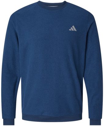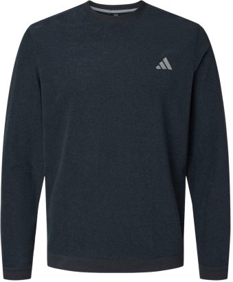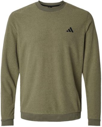 Adidas Men's Terry Loop Crewneck Sweatshirt made of 7.6 oz./yd² (US), 12.7 oz/L yd (CA), 76/24 recycled polyester/viscose with ribbed neck, cuff, and waistband. And contrast embroidered logo on left chest.