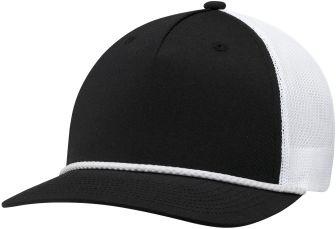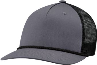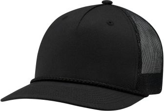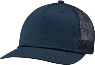 The Ajm Polycotton / Polyester Mesh cap is a 5 Panel Constructed cap with a thick rope above peak with a deluxe buckram laminated front panel with Pro-stitch. It has a slightly-curved peak with 8 rows of stitching.